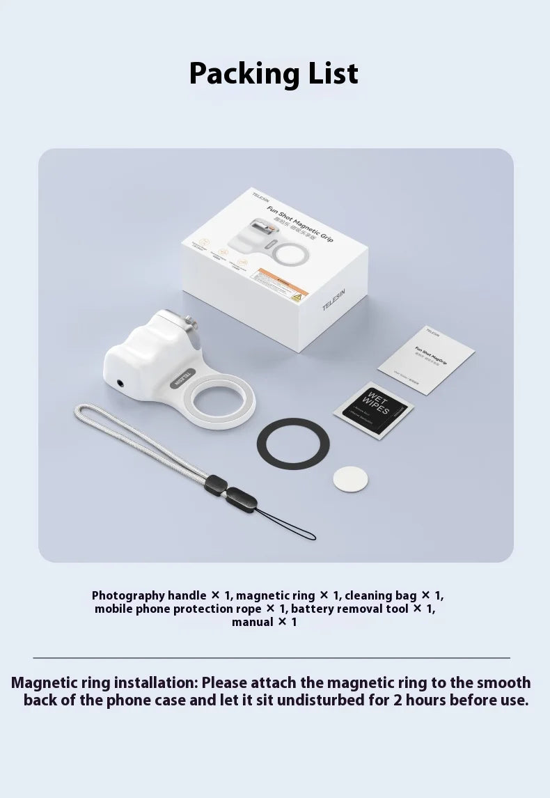 Capture stunning photos and videos effortlessly with this magnetic Bluetooth phone grip. Designed for comfort and stability, it features an ergonomic handle, detachable remote, and dual-sided fill light—perfect for vlogging, travel, and everyday photography.